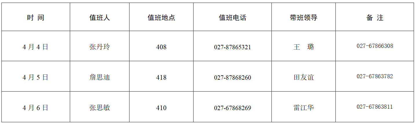 3.如遇紧急事情,请与带班领导联系。学校总值班室、保卫处、校医院、后勤保障部水电中心实行24小时应急值守,值班电话为:总值班室027-67868046,保卫处027-67868110,校医院027-67867177,水电中心027-67861703。