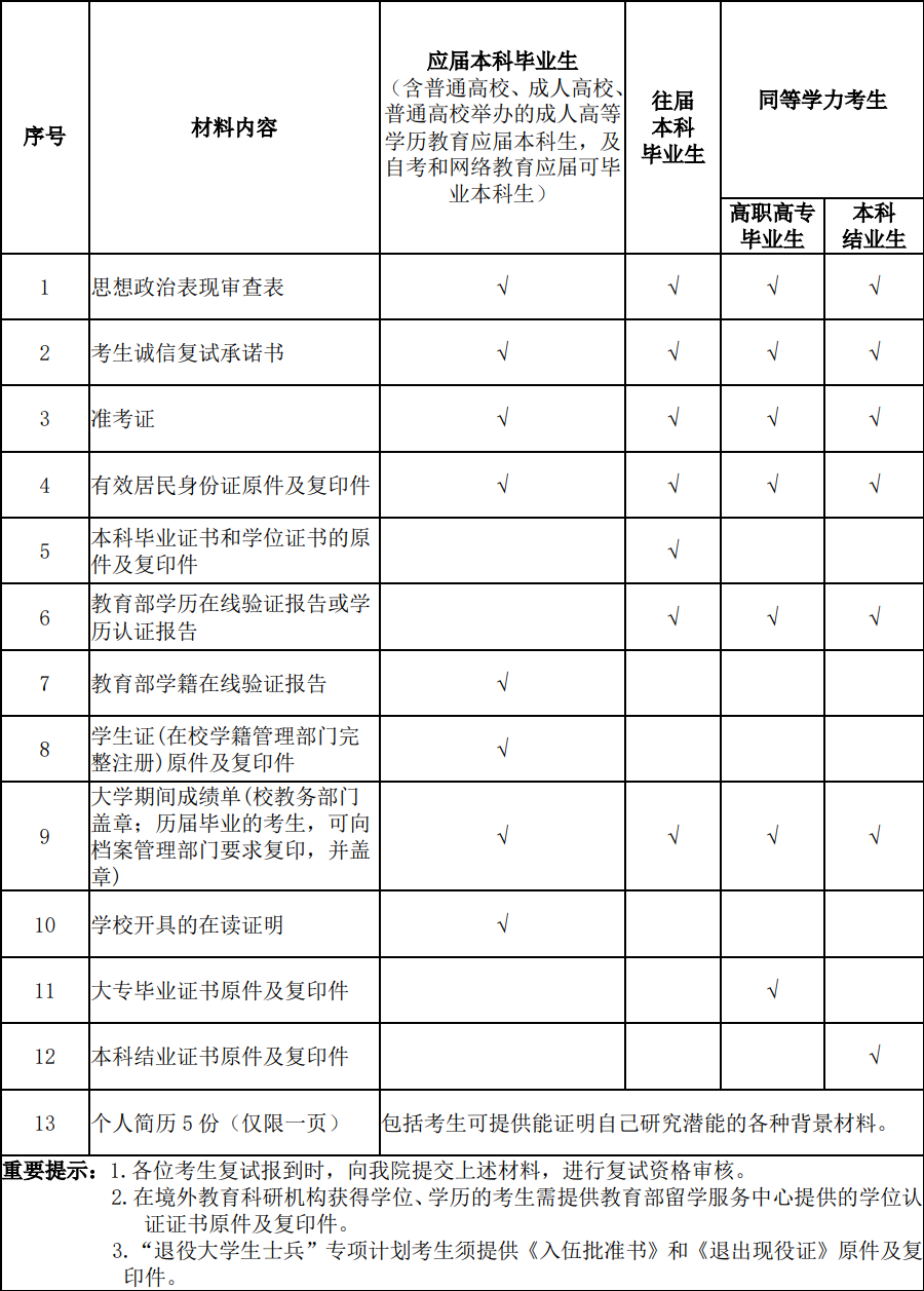 往届毕业生:本人准考证复印件、有效居民身份证复印件(军人提供军官证复印件)、“思想政治表现审查表”原件(所在单位人事部门签署意见并盖红章)、《考生诚信复试承诺书》、本科毕业证书复印件、学位证书复印件、本科期间成绩单原件(有人事档案所在部门盖的红章)、教育部学历在线验证报告或学历认证报告打印件(来源地址: http://www.chsi.com.cn/xlcx/)。
