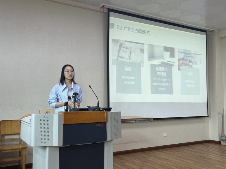 李杨茹着重从笔试准备和面试现场考核两方面分享了广州市应聘经验。她特别提到:面试试讲的要求逐年提高,尽量要做到试讲过程脱稿、有学法指导且教学语言要丰富、教学内容要有层次性与延展性等。在前期筹备时要梳理全学段教材,从国家精品课程资源网站上学习常规课和名师课的讲法并整理出自己的讲课思路,以更加从容备考。