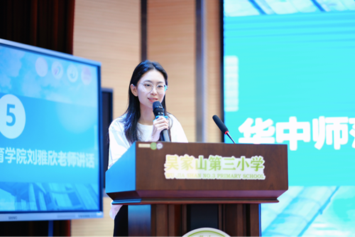 刘雅欣总结动员时表示,在实践前期筹备中,吴家山第三小学的师生们在助力学院发展、辅导学生成长、强化院校沟通等方面不惜余力,给予了许多支持与帮助。今年正值华中师范大学建校120周年,她希望同学们在暑期社会实践中牢记“为党育人、为国育才”的教育重任,践行“青春服务、志愿担当”的青年诺言,让“爱在华师”的奉献精神滋养吴家山第三小学同学们的纯洁心灵。
