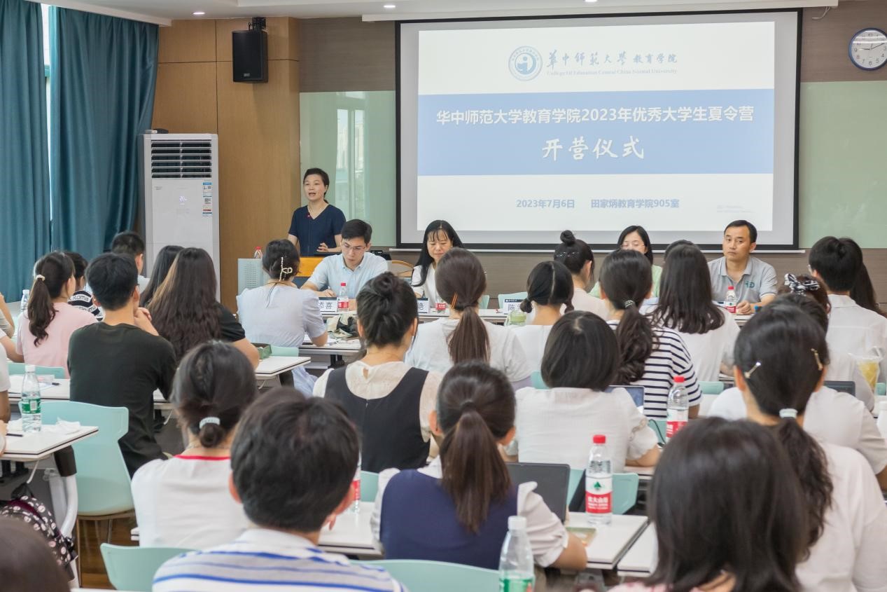 7月6日上午,教育学院2023年优秀大学生夏令营开营仪式在田家炳教育书院905室举行。教育学院党委书记陈雪玲、副书记苏春艳、副院长雷江华教授、教育学系主任程红艳教授、特殊教育系主任徐添喜副教授、教学秘书甘安虹出席开营仪式。开营仪式由雷江华教授主持。陈雪玲书记在致辞中对参与本次夏令营活动的各位营员表达了热烈欢迎和殷切希望。同时,她对学院和学科的发展做了一个精要的介绍,表示我院教育学已经进入国家一流学科建设行列,既有历史的传承,也有创新的活力。希望同学们能够以饱满的热情和积极的态度参与其中,了解、培养自己的专业兴趣,激发、挖掘自身的学习潜力,寻找、定位未来的学习目标,从而为今后的学习、研究深造打下更好的基础。最后,她祝愿本次夏令营活动圆满成功,盼望在秋高气爽、丹桂飘香的季节与同学们再次相会。