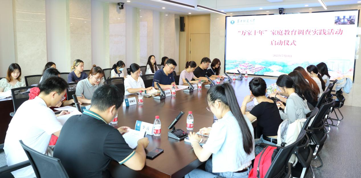 叶飞在致辞中高度肯定了华中师范大学教育学院师生长期以来深入基层、乡村,以实地走访调研助力乡村振兴,真正扎根中国大地做研究的优良传统和突出成效。他指出,“万家十年”家庭教育调查是学校落实与湖北省妇联、湖北省教育厅共建家庭教育学院的重要举措,相关调研成果将成为发布湖北省家庭教育蓝皮书的重要依据。他希望,“万家十年”调研实践活动立足专业特色,有效拓展人才培养的时空广度,引导和帮助青年学生在调研中学到真知识、开展真研究、解决真问题、练就真本领。