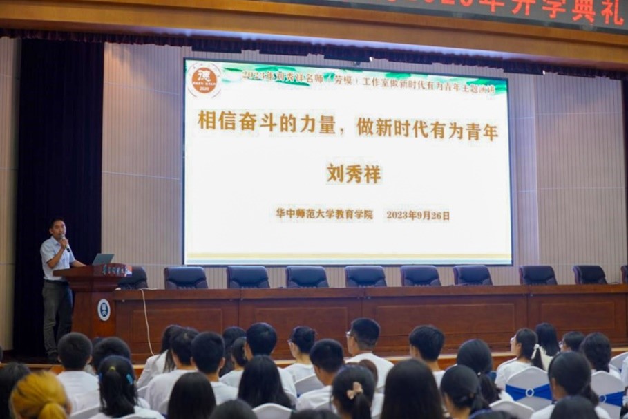 教育学院融媒体中心讯(通讯员 蔡亚男) 9月26日下午,华中师范大学教育学院2023年开学典礼暨第54期德育课堂在科学会堂一楼报告厅举行。党的二十大代表、贵州省望谟县实验高中副校长刘秀祥,教育学院党委书记陈雪玲、副书记苏春艳、副院长田友谊、副院长雷江华、教育学系主任程红艳,2023级本科生班主任代表、本研辅导员代表以及300余名本研新生参加活动。活动由苏春艳主持。