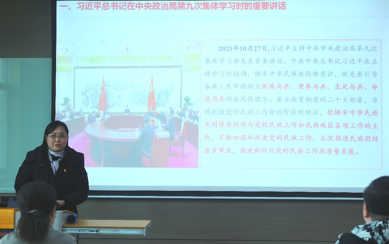 许锋华带领大家集中学习习近平总书记在中共中央政治局第九次集体学习时的重要讲话精神,解读了铸牢中华民族共同体意识的深刻内涵与重大意义,阐述了其中的理论渊源与基本任务。她指出,中华民族是中华大地各类人群浸润数千年中华文明,在共同缔造统一多民族国家的历史进程中,形成的具有共同历史文化记忆的人民共同体;学院要充分发挥教育学一流学科优势,加强课程建设和教材编写,推进铸牢中华民族共同体意识融入到教书育人全过程。