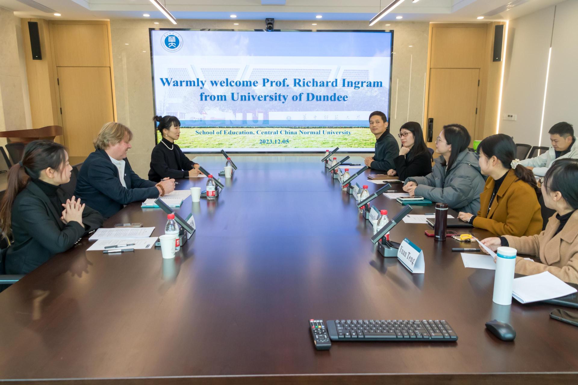 教育学院融媒体中心讯(通讯员 胡力扬 刘馨雨)12月5日下午,英国邓迪大学教育与社会学院Richard Ingram教授来我院访问交流,会议在田家炳教育书院901报告厅顺利举行。华中师范大学国际交流与合作处项目专员阮劭老师、张芷珣老师,教育学院党委副书记王璐、课程与教学研究所姚林群副教授、高等教育研究所邹义欢副教授、教育经济与管理研究所滕媛老师、《教育与经济》副主编叶庆娜老师等参会交流,会议由滕媛主持。