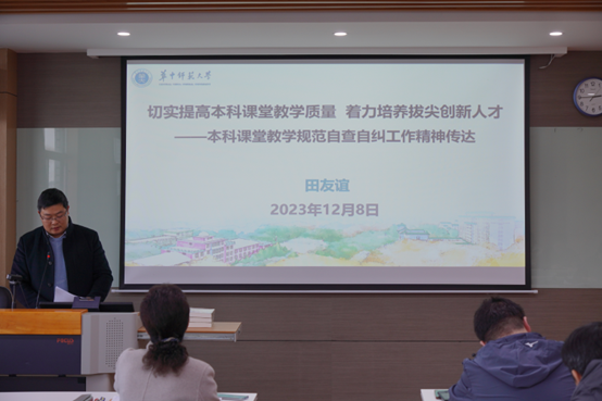 田友谊向全院教职工传达了学校开展本科课堂教学规范自查自纠工作的精神,强调要高度重视自查自纠,加大课堂督导与巡查。田友谊从本科课堂教学规范自查自纠工作精神落实情况、认真落实教师是课堂教学管理第一责任人、教学计划严格执行、教学异动规范管理、强化课堂教学主阵地作用等五个方面详细传达了自查内容。