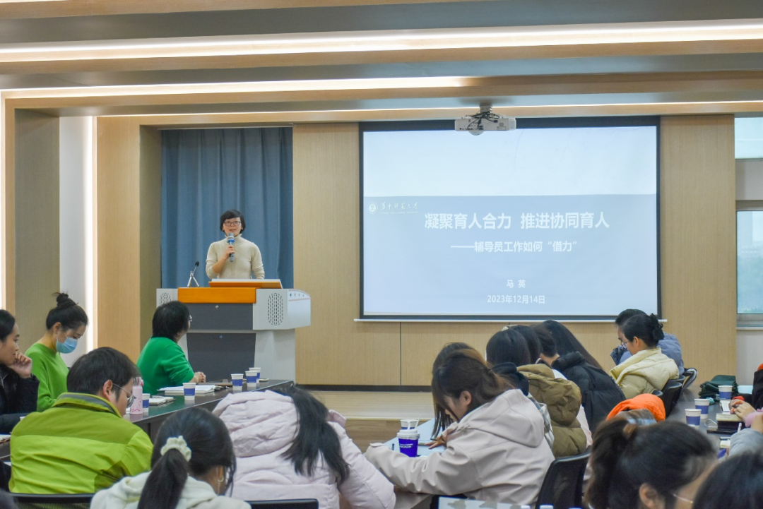 物理科学与技术学院党委副书记马英以“凝聚育人合力,推进协同育人——辅导员工作如何‘借力’”为主题,从辅导员工作实际出发,结合个人辅导员工作经历,深入浅出地阐述了自己“学工团队凝聚合力,搭建学生成长平台”的学生工作理念,并从“推动‘全员育人’是抓好学生工作的客观需要与重要方法”、“辅导员应‘借力’的四类关键育人主体”、“辅导员‘借力’开展工作的案例解析”三个方面进行了介绍与分享,鼓励辅导员们充分调动专业教师、本科生班主任、研究生导师、学生家长等多方力量,推动育人共同体建设,以“内在蓄力、外在借力、协同发力”助推学生工作高质量发展。