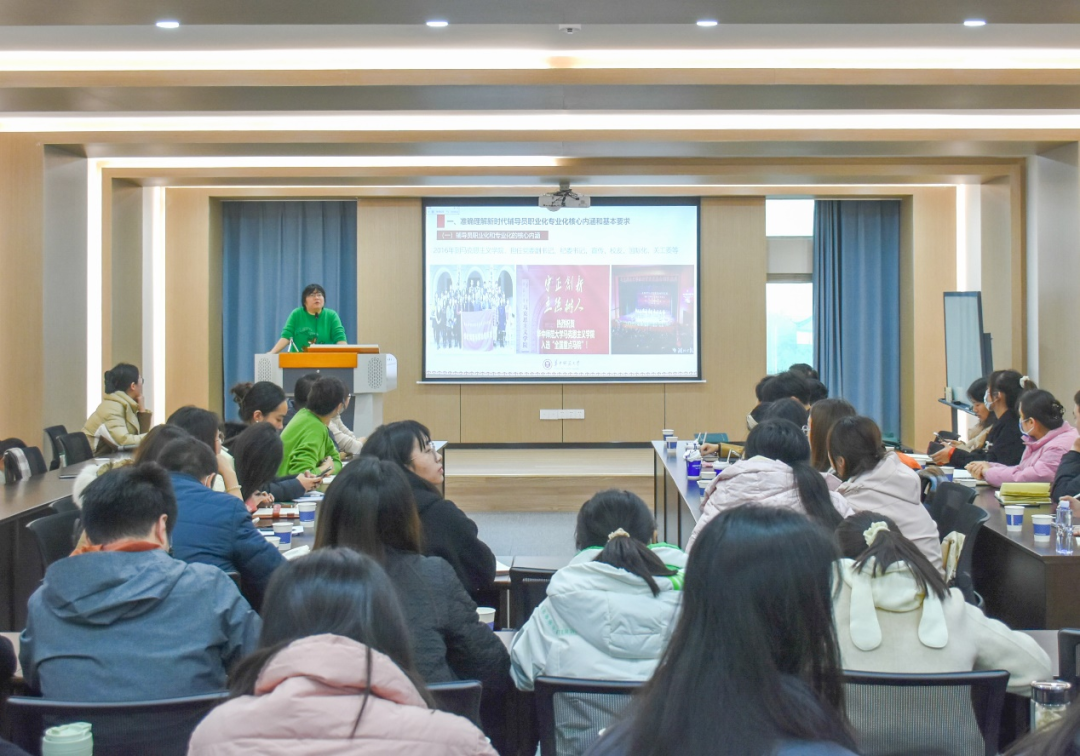 马克思主义学院党委副书记邵莉莉以“深耕一线,砥砺前行,勇做有温度的学工人”为主题,围绕“深耕一线”“聚焦主业”“砥砺前行”等方面深入分析了新时代辅导员专业化成长与发展的内涵,以“身份认同、岗位职责”切入,通过案例介绍与经验分享,从“守底线,保民生,促发展”、“学校学院放心,全体师生认可,个人发展顺畅”等维度,讲述了辅导员如何在新形势下扎实开展“有温度的教育”,努力争做“有温度”的学工人。