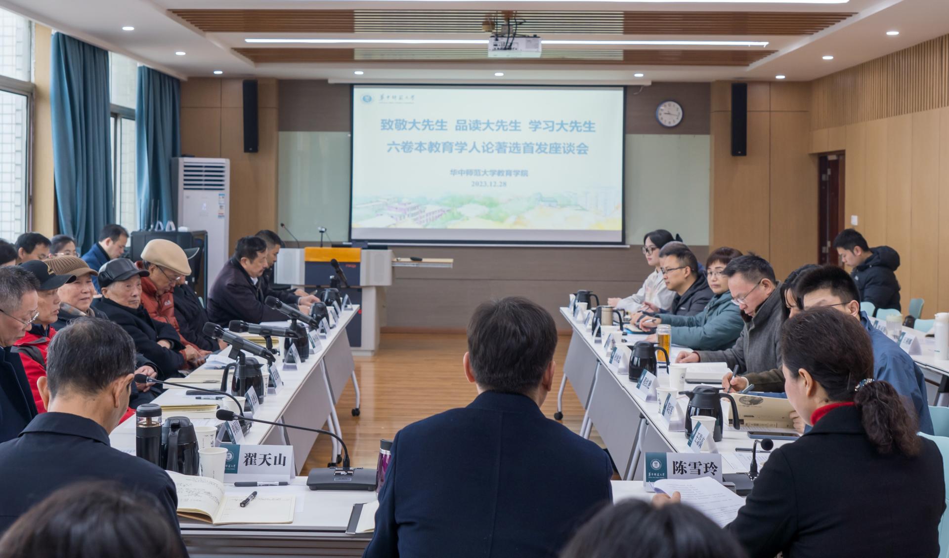 教育学院融媒体中心讯(通讯员:刘馨雨)12月28日,为大力弘扬教育家精神,传承教育学科优秀文化,涵养新时代大先生,教育学院在田家炳905会议室隆重举行《陈时论著选》《黄溥论著选》《杨葆焜论著选》《任钟印论著选》《王道俊论著选》《董宝良论著选》等六卷本教育学人论著选首发座谈会,深入开展“致敬大先生,品读大先生,学习大先生”活动。湖北省政协原秘书长、湖北省政协理论研究会会长、华中师范大学教育学院教授翟天山,六卷本教育学人论著选主编,学院离退休老同志代表,党政领导班子成员,教师和学生代表等近五十人参加,座谈会由院党委书记陈雪玲主持。