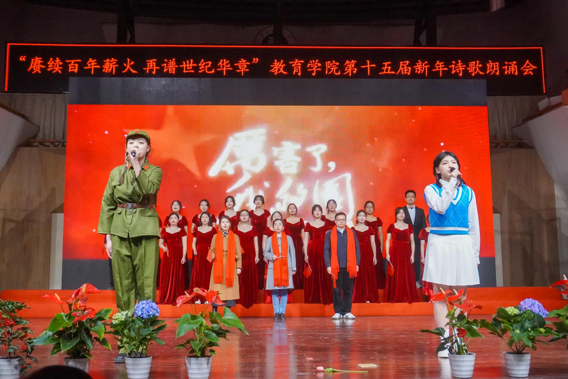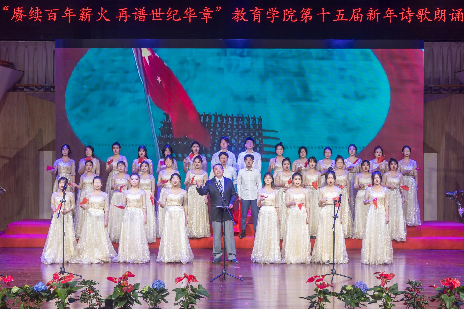 教育学院融媒体中心讯(通讯员 刘馨雨等)12月28日晚,教育学院第十五届“赓续百年薪火,再谱世纪华章”新年诗歌朗诵会在华中师范大学音乐厅隆重举行。学院党政班子、党委委员、各系所教师代表、离退休教师代表、院友代表及本研学生近400人参与活动。