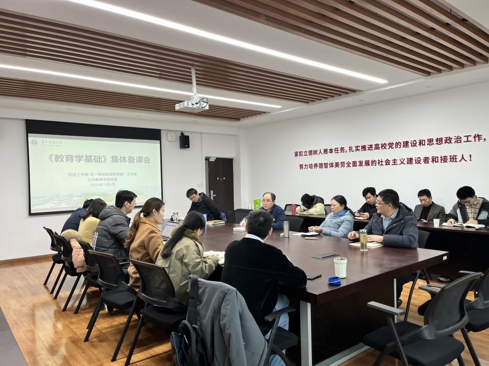 本科教学办公室讯(通讯员 张楚钰)为发挥“先进工作者·五一劳动奖章获得者”工作室的引领示范作用,加强基层教学组织公共教育学教研室建设,提升教学质量,提高课堂实效,实现优势互补和资源共享,“先进工作者·五一劳动奖章获得者”工作室与公共教育学教研室于2024年1月5日上午8:30在田家炳教育书院909会议室联合举行了教育学基础集体备课会。本次集体备课会由“先进工作者·五一劳动奖章获得者”工作室主持人与公共教育学教研室主任田友谊主持,董英副教授、卢旭副教授、罗儒国副教授、孙银光副教授、邢欢副教授、张添翼副教授、王远伟副教授、刘庆龙博士、杨大伟博士、白颖颖博士、孙冉博士、滕媛博士、程豪博士、程哲博士、高晓智老师参加会议。