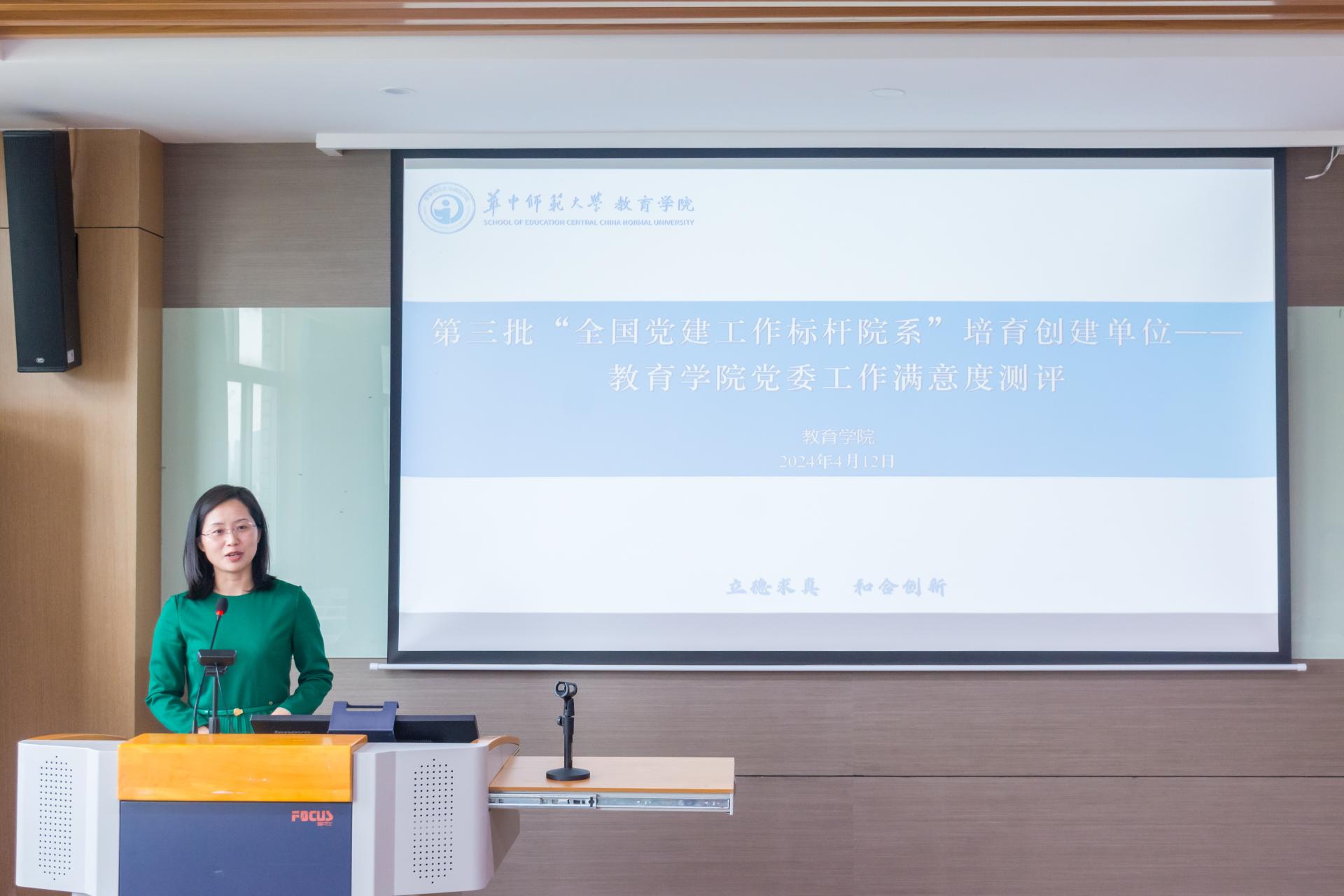 本次会上党委副书记苏春艳就第三批“全国党建工作标杆院系”培育创建单位满意度测评工作进行了布置和说明。学院党政领导班子成员、下属党组织负责人、教代会代表、党内外师生代表等对教育学院党委“全国党建工作标杆院系”创建工作满意度进行了现场测评。