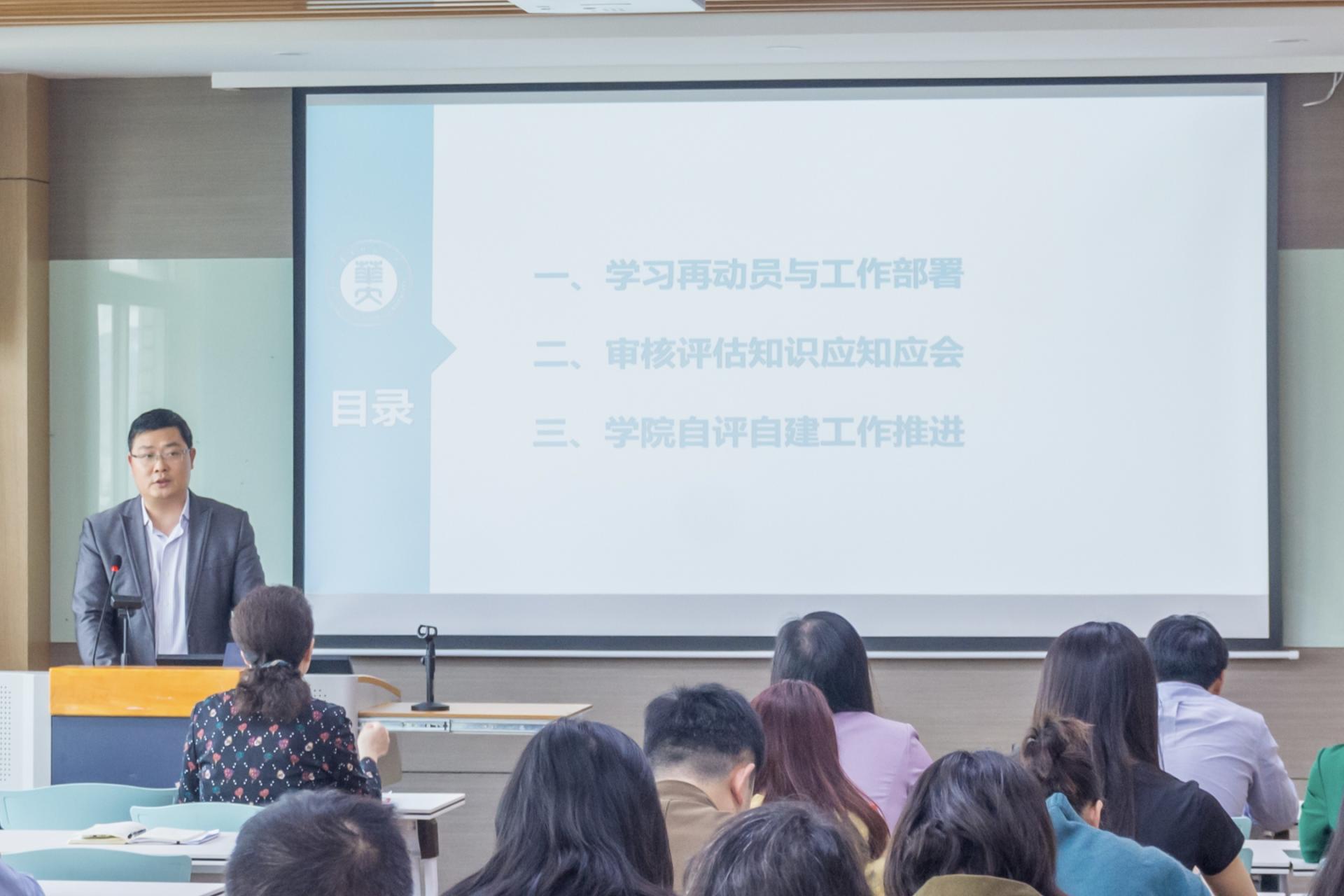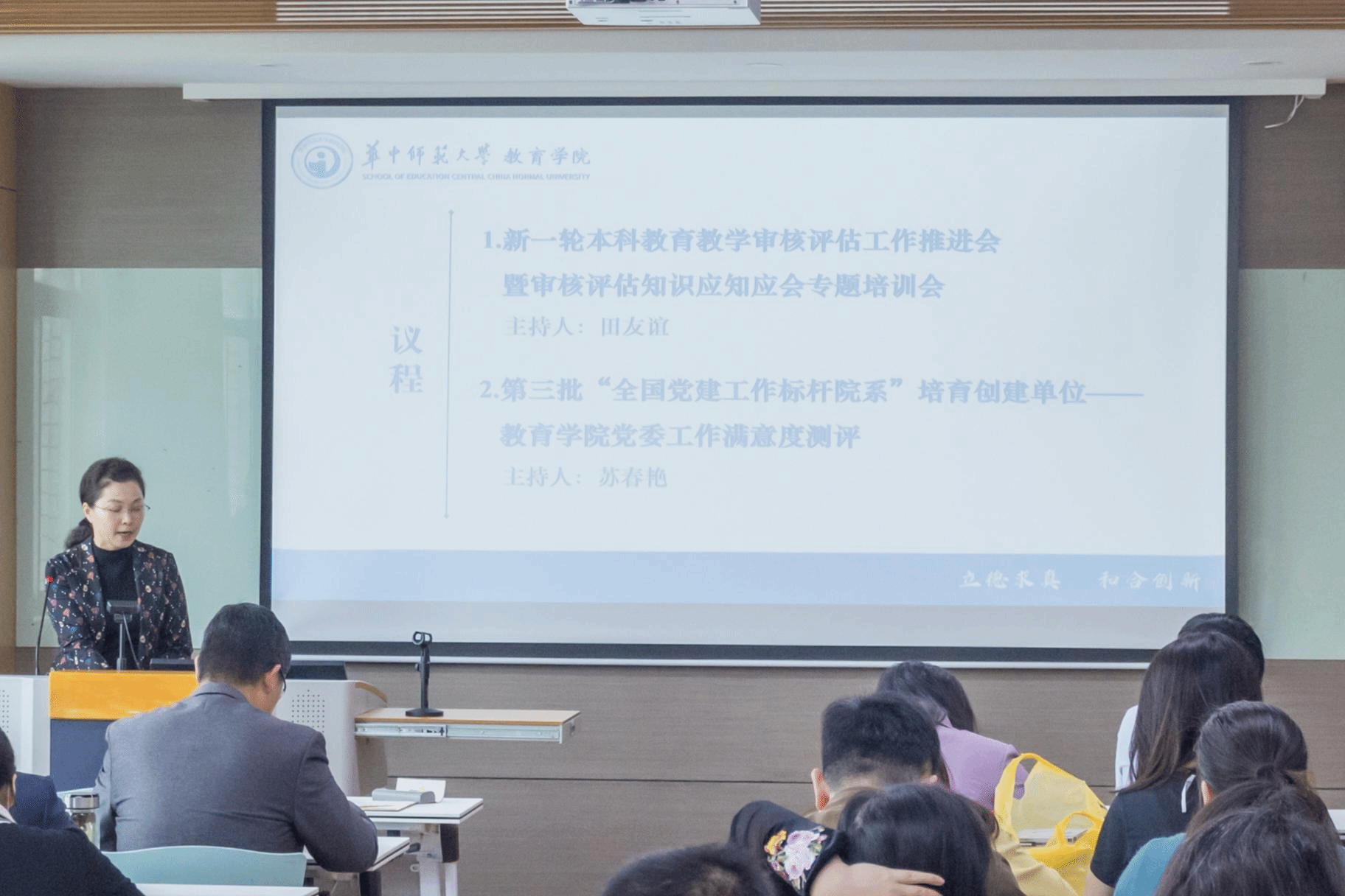 副院长田友谊作《新一轮本科教育教学审核评估工作推进会暨审核评估知识应知应会专题培训会》专题报告。他系统梳理了教育学院新一轮本科教育教学审核的工作进展,对后续工作进行了相应部署。他基于评估的新变化、基本原则、工作目标等角度深入剖析了新一轮本科教育教学审核工作中的“应知应会”,指出学院全体教职工应加强对学校办学方向、育人过程、学生发展、质量保障体系等方面的审核,落实“以本为本”“四个回归”,强化学生中心、产出导向、持续改进。针对新一轮评估指标体系的主要内容及特点,田友谊整理了审核评估工作的工作程序,总结了其在方式方法上的创新点,解释了“1+3+3”报告的具体内涵,并对评建改、审核材料整理和迎评工作进行了详细的布置,明确了学院、教师、教学教辅人员、行政管理人员和学生在迎评工作中的职责和要求。
