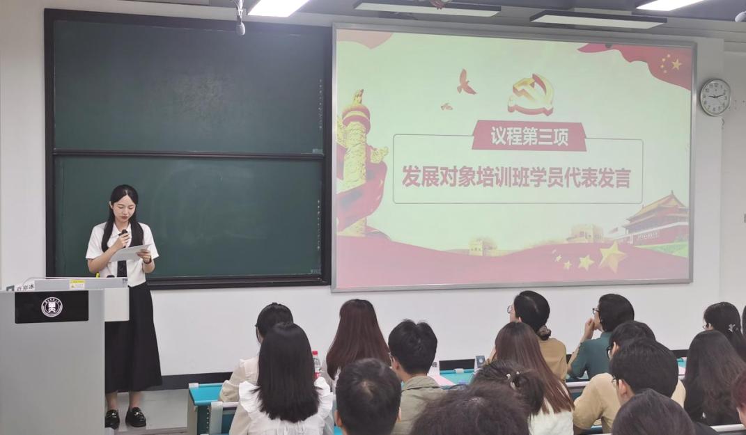 教育学院研究生肖寒冰同学代表全体学员发言,她从自身经历出发讲述了自己的入党动机,认为每一位党员都应树立全心全意为人民服务的宗旨意识。她代表全体发展对象做出承诺,表示将以高度的热情参与本次培训活动,严格遵守培训纪律,力争通过这次宝贵的机会提升自身理论水平,为早日成为一名正式党员打下坚实的基础。