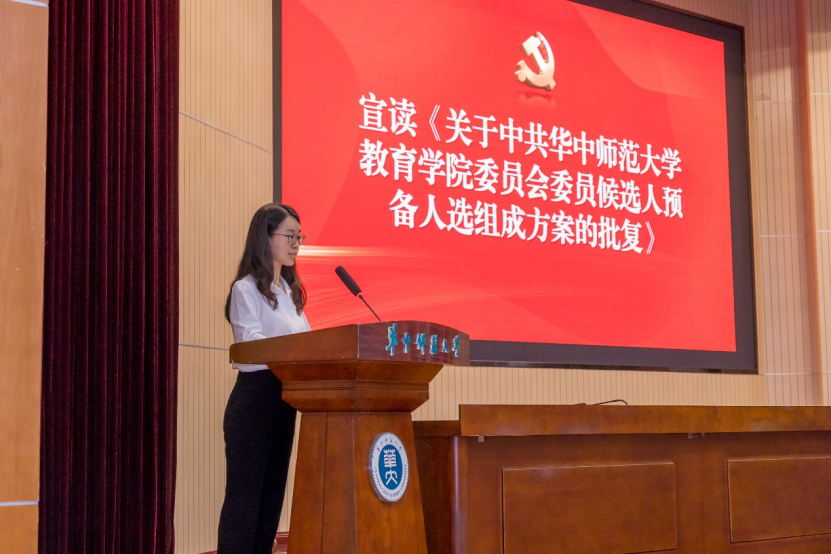 胡余映同志宣读校党委《关于中共华中师范大学教育学院委员会委员候选人预备人选组成方案的批复》。经由校党委常委会会议研究,同意中共华中师范大学教育学院新一届委员会委员候选人预备人选名单。