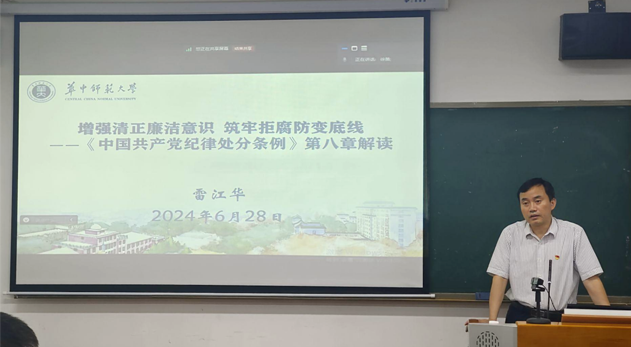 教育学院融媒体中心讯(通讯员 徐蕾)6月28日下午,教育学院院长、党委副书记雷江华以“增强清正廉洁意识 筑牢拒腐防变底线--<中国共产党纪律处分条例>第八章解读”为题讲授党纪学习教育专题党课,特殊教育党支部全体党员参加。