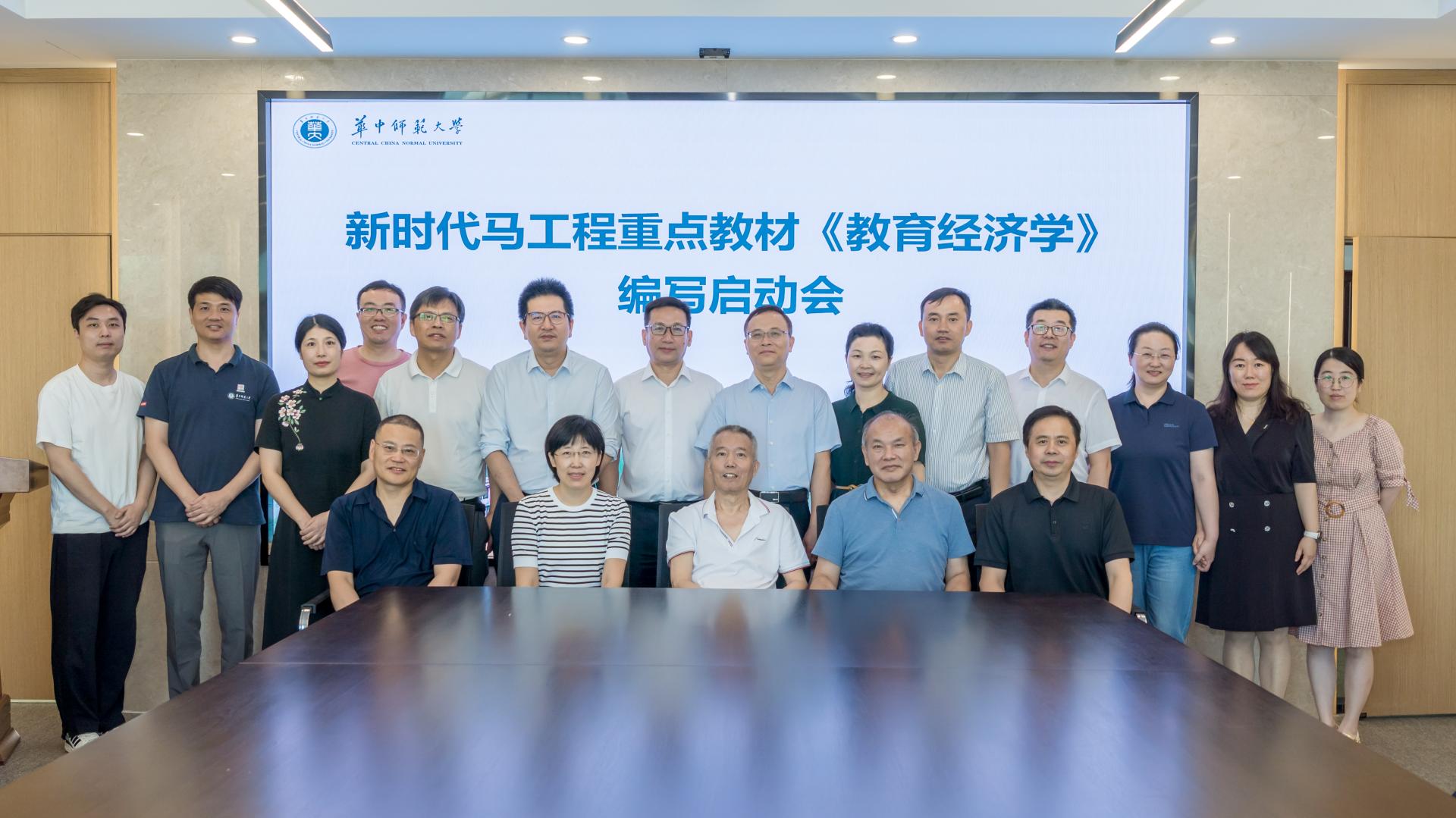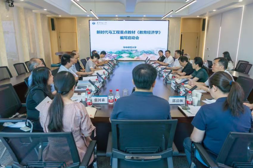 教育学院融媒体中心讯 7月21日上午,新时代教育部马工程重点教材《教育经济学》编写启动会在田家炳教育书院召开。人民教育出版社教育理论编辑室主任王迎兰、副主任韩华球、编辑龚鹏飞、程军,广州大学副校长吴开俊教授、南京大学教育研究院党委书记、院长黄斌教授、我校马克思主义学院万美容教授,共同为《教育经济学》的编写工作出谋划策。我校本科生院院长刘清堂教授、教育学院党委书记陈雪玲、教育学院院长雷江华教授、教育学院副院长郑刚教授、《教育经济学》主编范先佐教授、副主编、研究生院院长雷万鹏教授及全体编写成员参加了启动会。