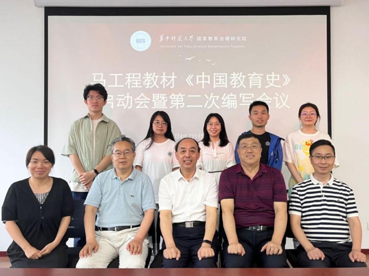 在教育部教材局和学校的领导下,教育史研究团队高度重视教材编写工作,并2024年7月3日下午召开了新时代教育部马工程重点教材《中国教育史》第一次编写工作会议。中国教育学会副会长、华中师范大学国家教育治理研究院院长、教育学院教授周洪宇,华中师范大学教育学院教授、国家教育治理研究院执行院长申国昌及各位参编专家,人民教育出版社编辑刘立德、冯卫斌、李卯、杨燕等参与会议。会议就第一批新时代教育部马工程重点教材《中国教育史》的编写目标、编写成员和编写计划进行商讨,并明确了基本的编写框架、编写要求以及守正创新的编写原则等。会议达成共识,《中国教育史》教材应进一步提高政治站位和学术站位,高度契合马工程教材编写要求,充分体现我们一贯倡导的教育制度史、活动史和思想史三位一体的学术主张,全面吸收学术史界最新研究成果。