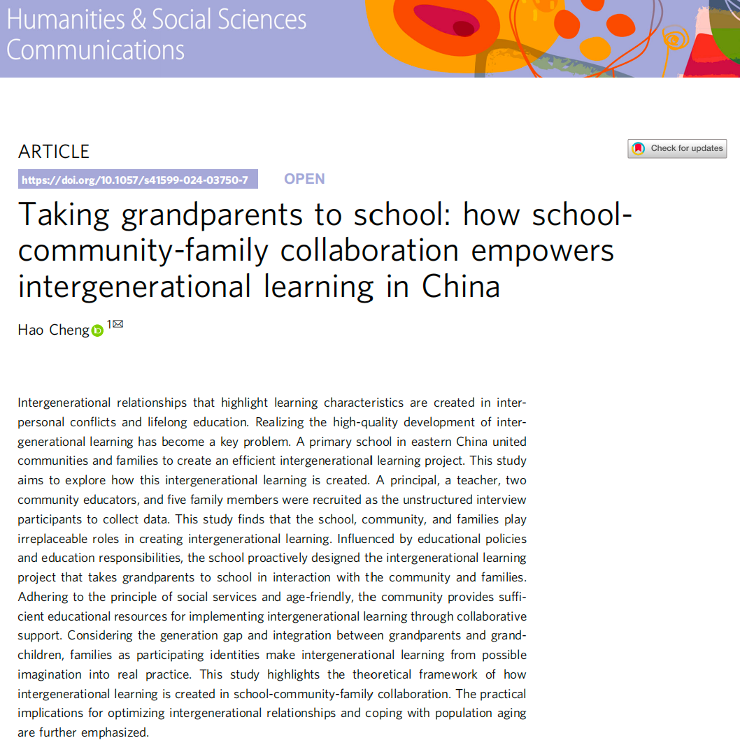 教育学院融媒体中心讯(通讯员 刘馨雨)近日,教育学院“主体教育理论创新研究团队”再取阶段性研究进展,相关成果“Taking grandparents to school: how school-community-family collaboration empowers intergenerational learning in China”在Nature子刊Humanities & Social Sciences Communications发表。教育学院教育学系程豪博士为独立作者。该研究得到“国家资助博士后研究人员计划(GZC20230921)”的支持。
