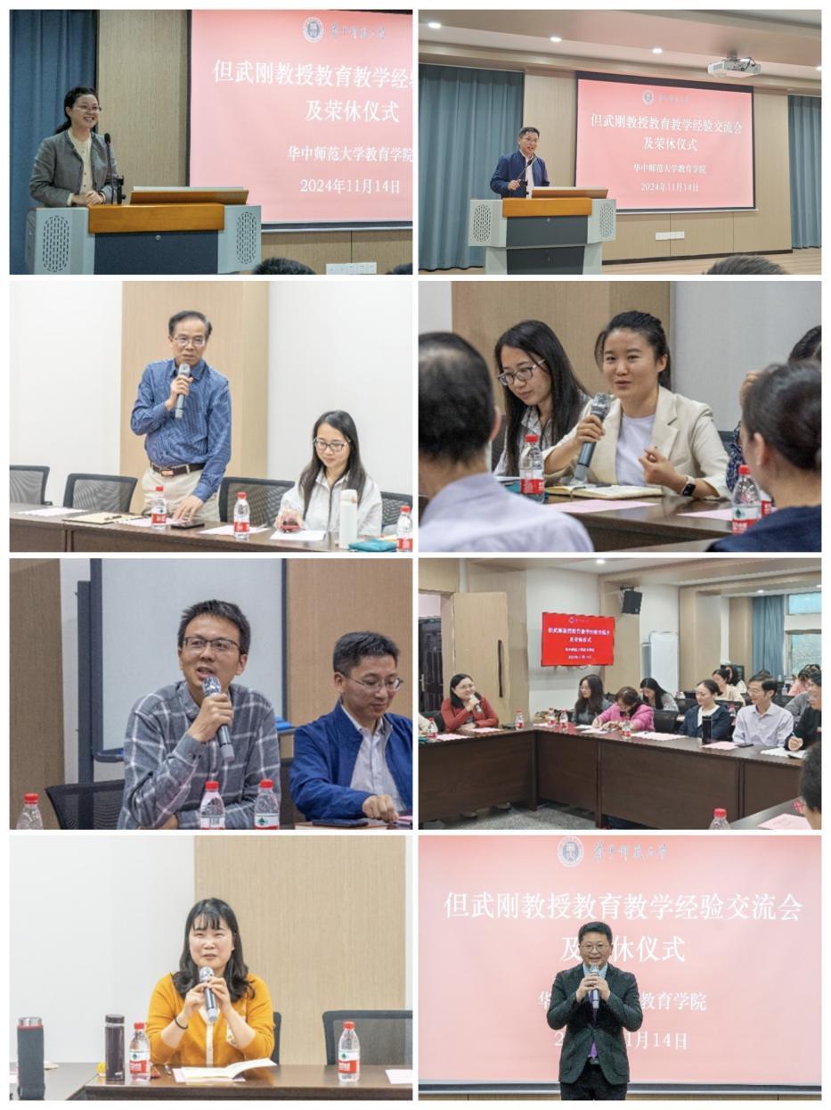 但武刚老师感谢学院领导、老师及同学们的陪伴与支持,并从研究、教育、教学和指导研究生四个方面分享教育教学工作经验。他鼓励年轻教师们要勇于担当、无私奉献,做真研究;要践行主体教育的理念、真正关心学生发展。他表示将永远铭记在学院度过的美好时光,继续关注和支持学院工作,祝愿教育学院蒸蒸日上、蓬勃发展。