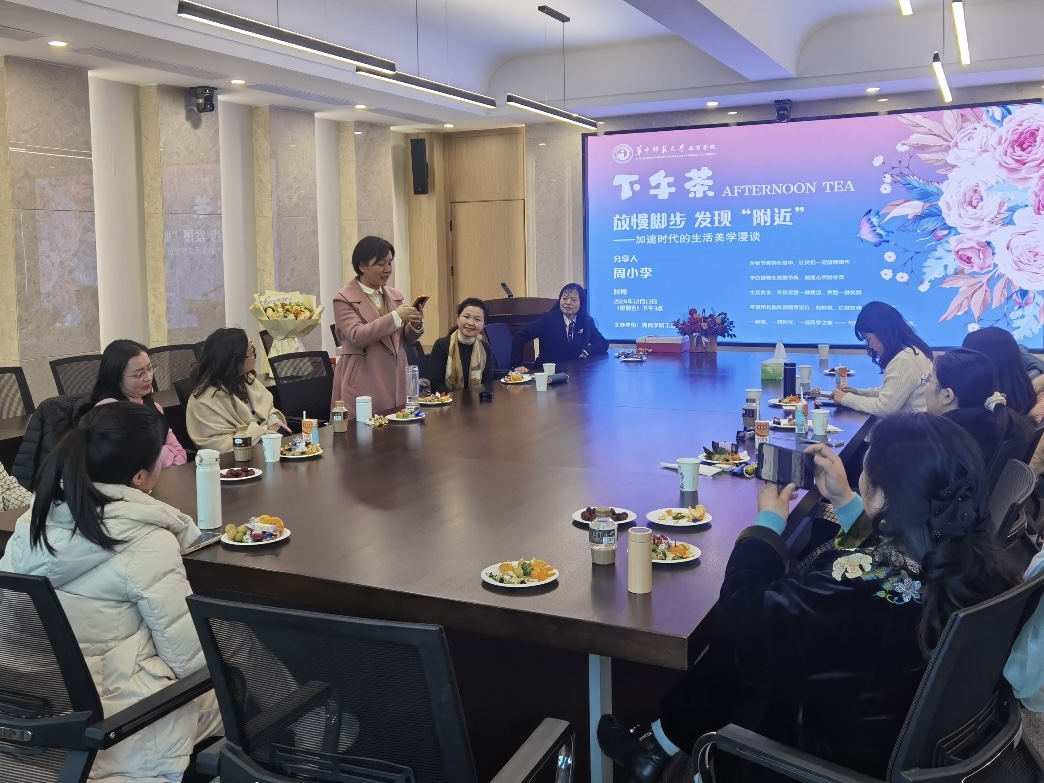 教育学院融媒体中心讯 (通讯员 张思敏)为丰富教职工业余生活,增进彼此间的情感交流,12月13日下午,我院工会在901会议室举办了第三期教职工下午茶活动。高等教育研究所周小李教授作“放慢脚步 发现‘附近’——加速时代的生活美学漫谈”主题分享,学院党委书记陈雪玲,教师代表等20余人参加,活动由院工会主席王建梁主持。