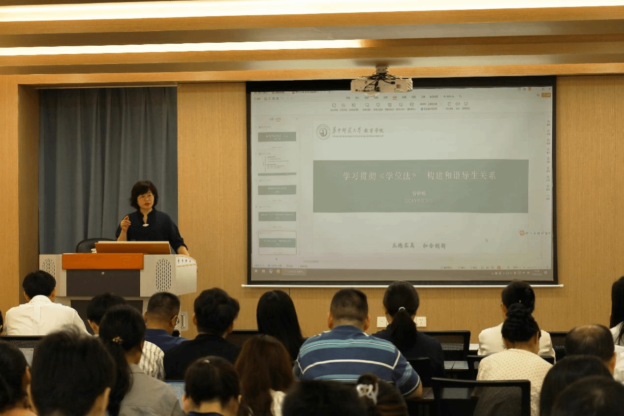 曾艳梅从立法背景、工作体制、学位授予资格与条件、学位质量保障等方面对《中华人民共和国学位法》(以下简称《学位法》)进行了全面说明,侧重介绍了我校在贯彻落实《学位法》系列重大举措,并对《华中师范大学学位授予工作实施细则》的出台背景、指导思想、目标任务和修订原则及相关新修订的文件进行了详细解读。针对如何构建和谐的导学关系,曾艳梅结合鲜活案例,对导学关系中的常见风险点进行了警示教育,警醒各位导师要恪守学术道德,加强对研究生的学术指导、人文关怀、心理关怀、就业与职业指导,做到因材施教,提升指导能力,规范指导行为,构建和谐导学关系。