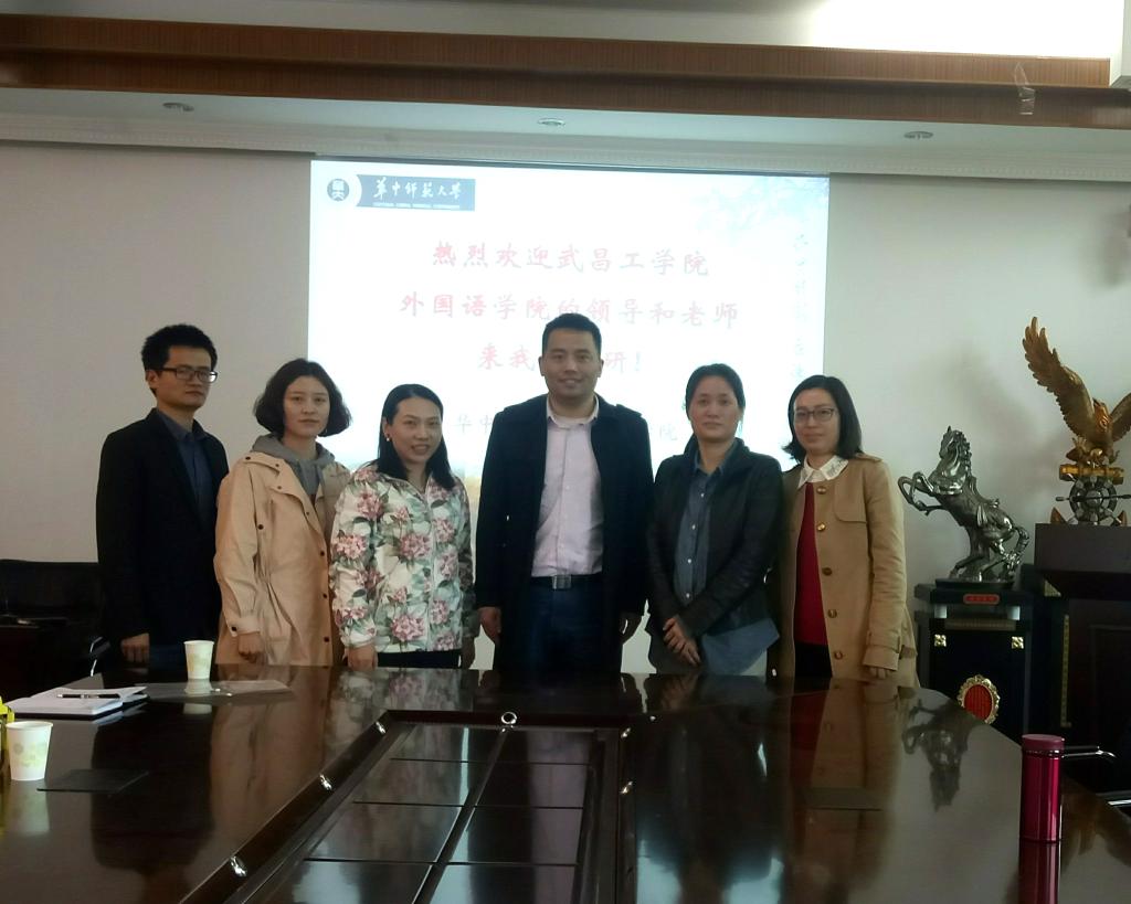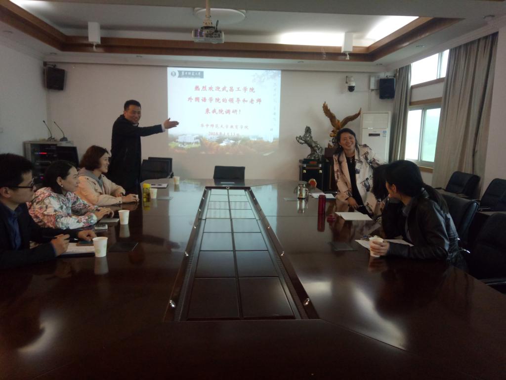 (通讯员:方美红 编辑:刘瑞)2018年4月13日上午,武昌工学院外国语学院赴我院调研,就学前教育专业建设问题进行交流学习。由武昌工学院外国语学院副院长赵团结老师带队,党总支副书记周慧敏老师、院长助理田妍妍老师、语言实验中心主任郑新桥老师组成调研队伍,一行四人来我院学习交流。我院学前教育系主任吴航老师、王雯老师和王鶄老师出席此次会议。