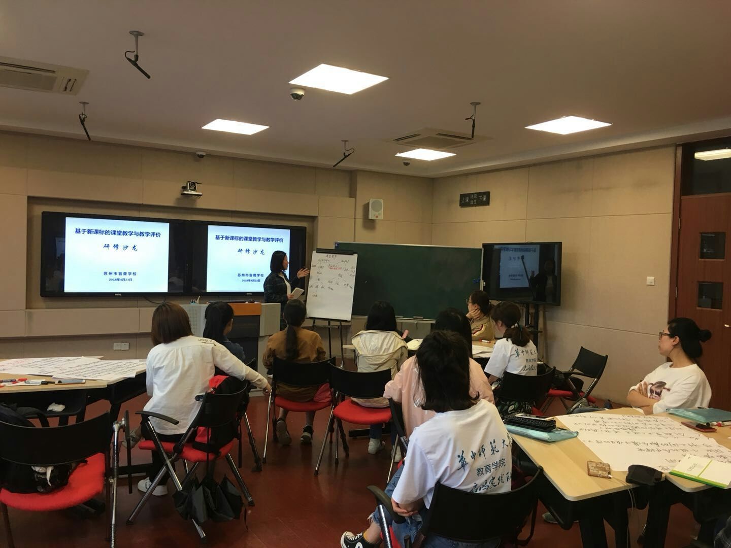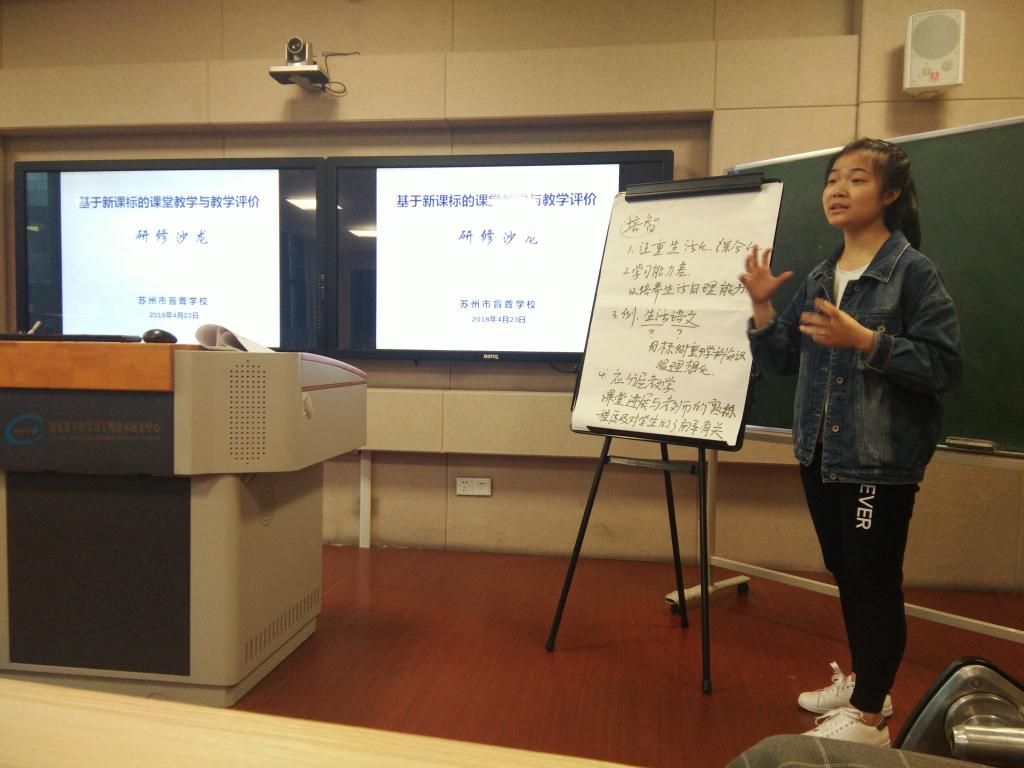 而另一边,参观苏州盲聋学校的无障碍设施之后,特教专业的8名队员与众多一线教师一起参与到特教教师专业发展探讨、特校德育创新实践专题探讨、心理辅助残障学生健康成长专题探讨、基于新课标的课堂教学与教学评价研修沙龙和教育教学管理座谈这样五场讨论会中,聆听了特教老师们的多角度分享。第四场研修沙龙上,2016级特教专业的赖元元针对新课标教学评价进行发言。