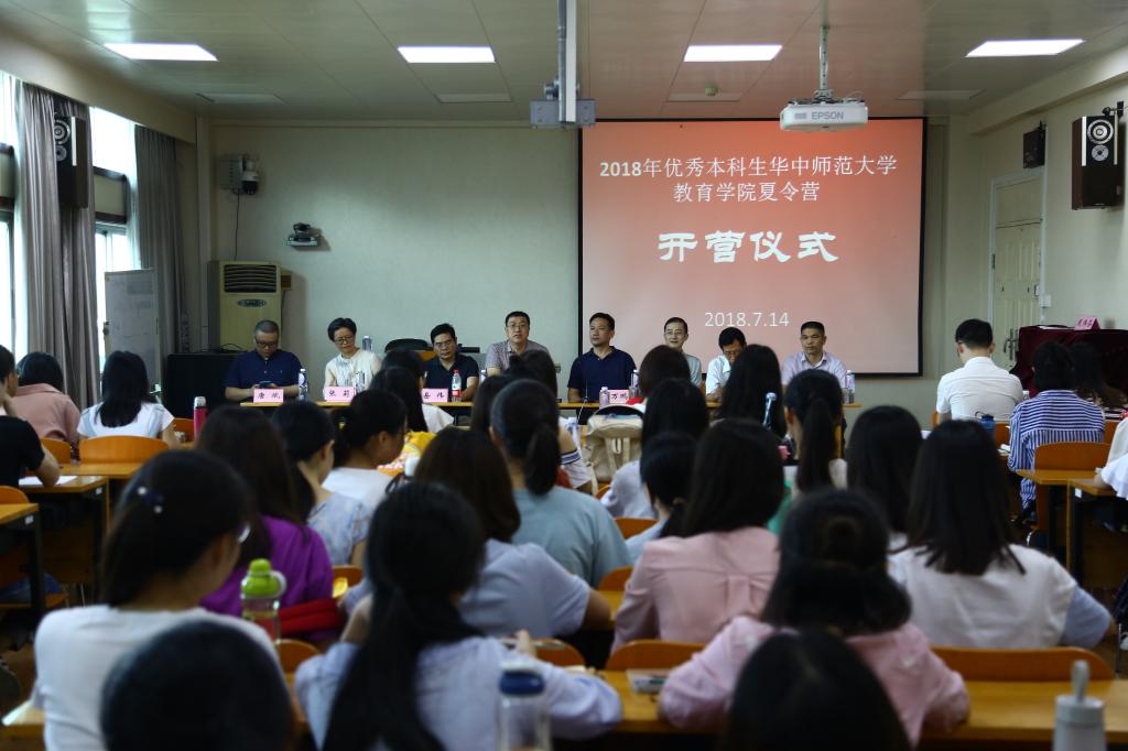 (通讯员:孙丹 摄影:王健 编辑:许家瑞)7月14日上午9时,华中师范大学教育学院在田家炳502教室隆重举行了”2018年优秀本科生夏令营”开营仪式,来自全国17所重点高校的80余名优秀本科生参加活动。开营仪式由教育学院副院长申国昌教授主持,院长雷万鹏教授出席仪式并讲话,他代表学院全体师生欢迎同学们的到来。岳伟教授、但武刚教授、但昭彬副教授、张莉副教授、唐斌副教授、李先军副教授、戴伟芬副教授、孙玉梅副教授等各专业导师代表一同出席开营仪式。