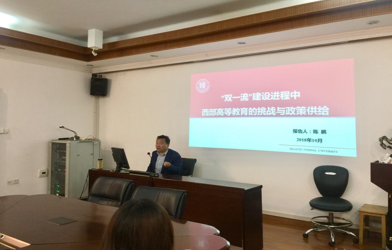 (通讯员:吴艳君 摄影:申慧宁 编辑:吴佳妮)2018年10月15日晚,由华中师范大学教育学院、湖北省教育政策研究中心主办的“博导论坛”第23期在田家炳624会议室成功举办。陕西师范大学教育学院院长、博士生导师陈鹏教授应邀以“‘双一流’建设进程中西部高等教育的挑战与政策供给”为题做学术报告。论坛由华中师范大学教育学院副院长、博士生导师申国昌教授主持。