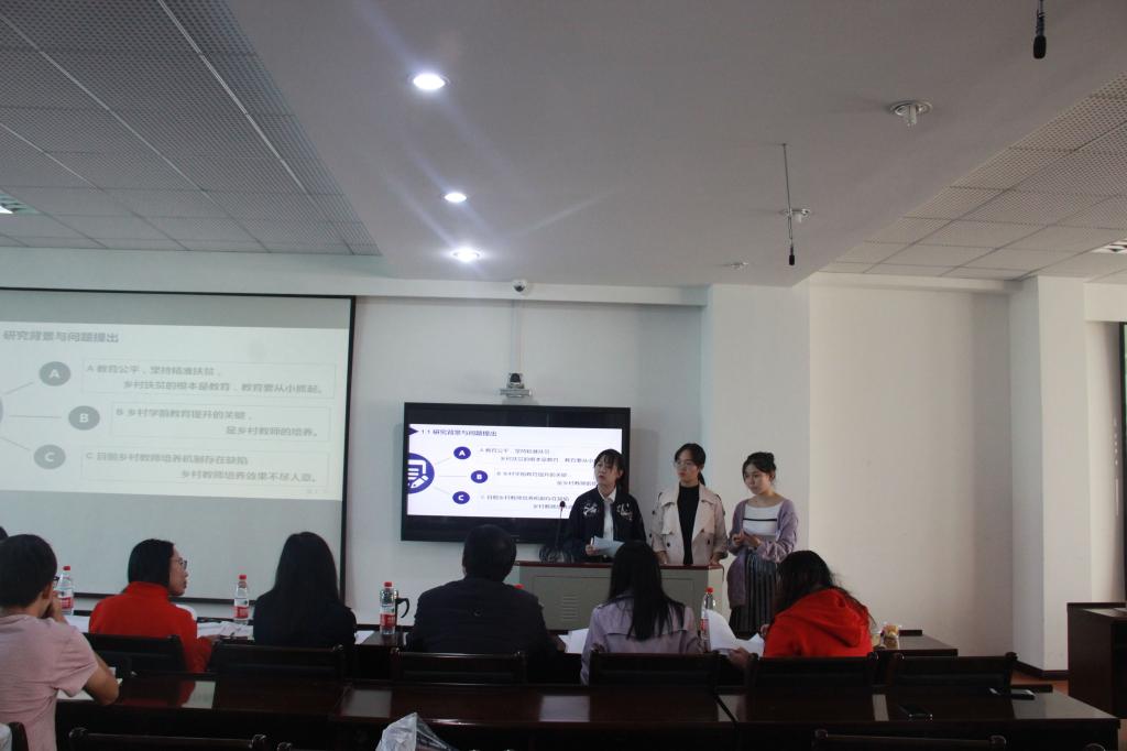 会议伊始,王倩倩老师介绍了五位评委老师和此次会议宗旨后,挑战杯校赛终审决赛预答辩正式开始。第一个上场答辩的是由16级学生郑怡岑负责,龚欣老师指导的“‘美乡新教,高校创行’——乡村幼儿园教师专业成长支持计划的实施与评估探究”项目。团队成员通过实地调研发现乡村学前教育具体情况,设计方案并实施,得出“‘新模式’推广必要”的结论。刘丽伟老师对此项目实施总体情况给予肯定,同时也认为在调研报告中应对要点加以解释,指出“结论不要推广得太广”、“要增加干预次数”。