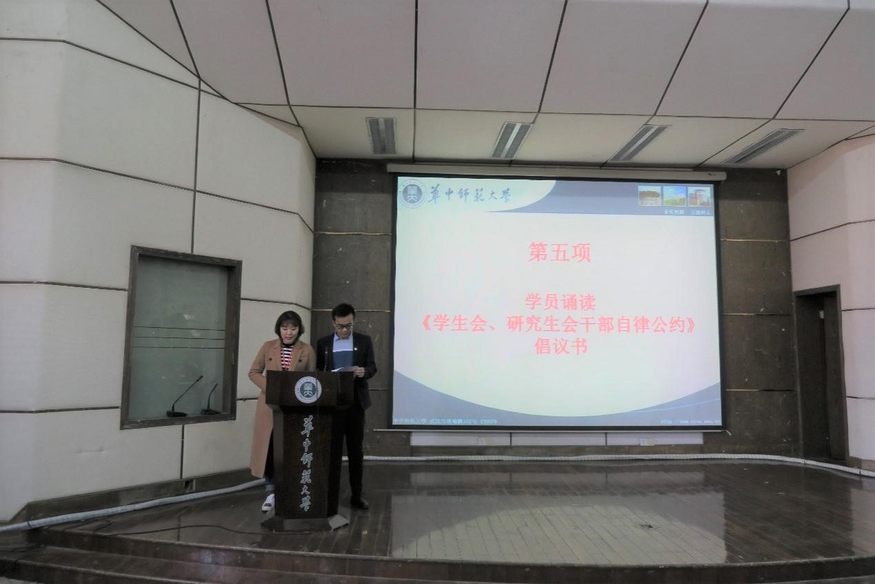 接着,全体研究生干部诵读《学生会、研究生会干部自律公约》倡议书,包括恪守学生本分、牢记本会宗旨、永葆理想主义情怀、扎扎实实做事、营造平等氛围、摒弃庸俗习气等六条公约。