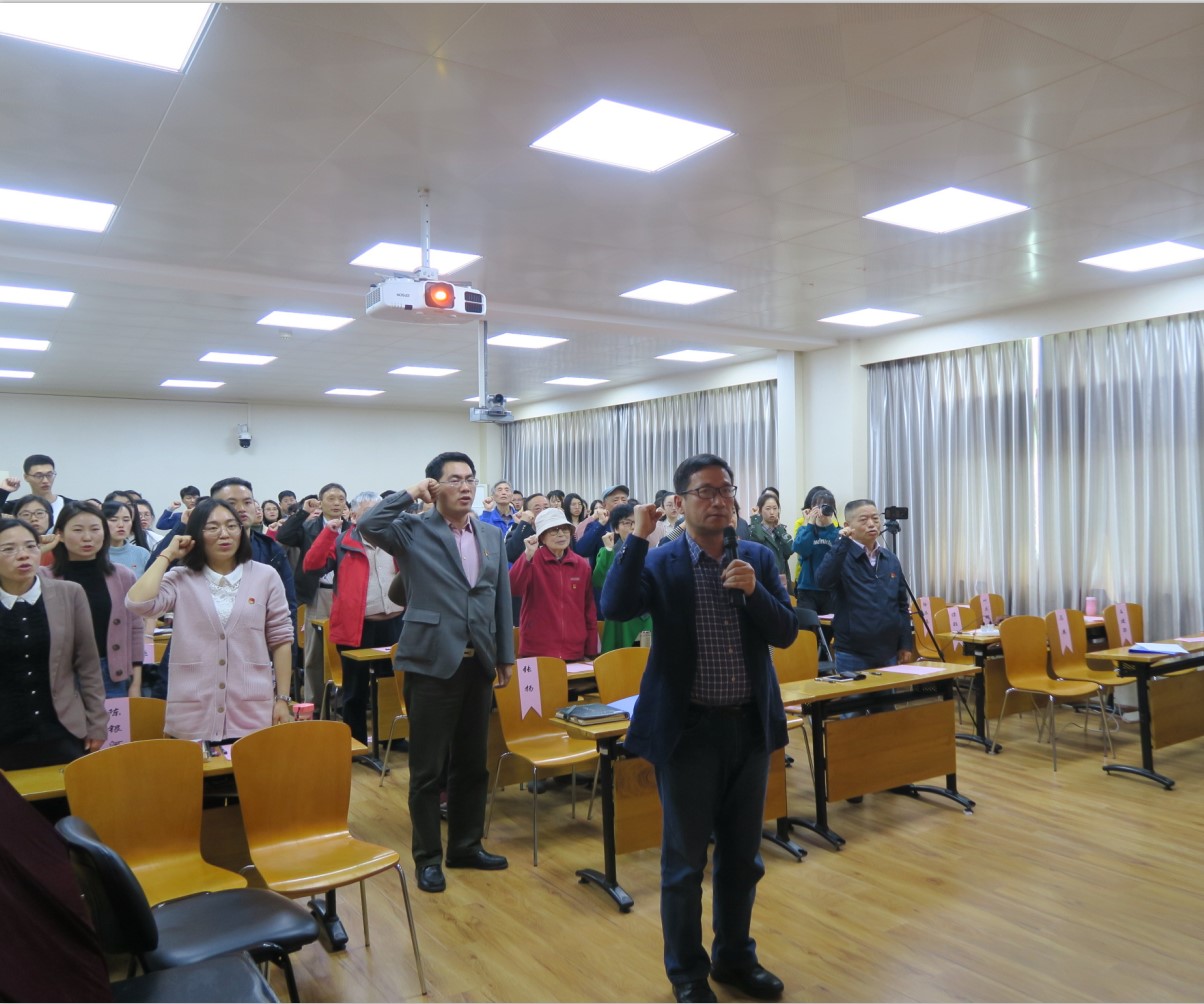 在院长、党委副书记雷万鹏的带领下,全体党员面向党旗、满怀敬意,高举右拳,重温入党誓词,铮铮誓言,不忘初心,牢记共产党员的责任与使命。