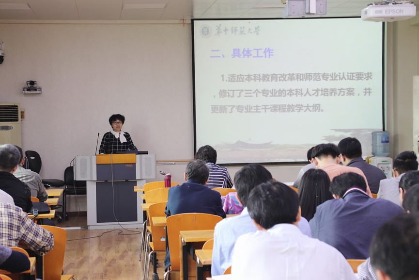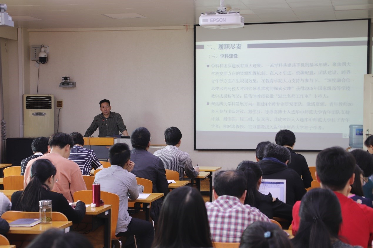 副院长蔡迎旗首先对2018年工作情况整体进行了报告,随后从具体工作开展情况、分管工作取得的主要成绩和个人教学与科研等三个方面进行了工作汇报,最后对五项具体工作提出了今后的努力方向。