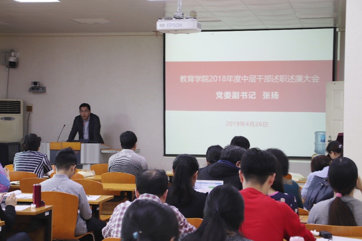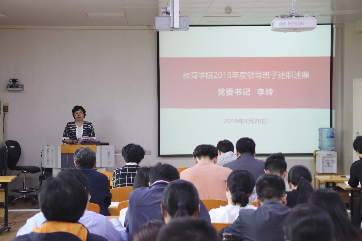 教育学院宣传中心讯(通讯员:覃娟 摄影:张萌 编辑:张萌)4月26日下午,我院于田家炳教育大楼502室召开2018年度中层干部述职述廉大会。会议由党委书记李玲主持,校人事处潘栋出席,我院全体教职工、部分退休支部党员和学生骨干代表参加会议。