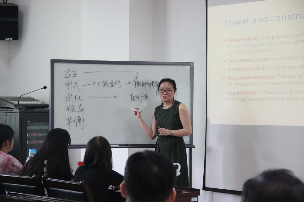 学前教育系的刘丽伟选择“学前教育领域的理论与流派”,重点阐述了皮亚杰的建构主义理论,肢体语言丰富有助于学生理解教学内容。
