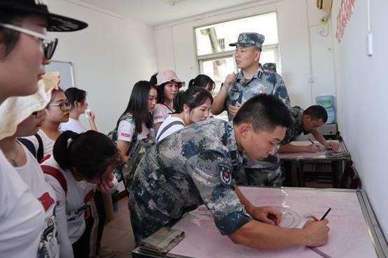 随后,在不打扰军人工作的前提下,我们近距离感受了雷达官兵的工作环境。在模拟训练中心,雷达兵一边用军队密语报信息,一边用电脑定位飞机的方位。在指挥中心,我们看见了不同于民用的军用地图,了解了雷达定位的原理。指导员介绍,“作为雷达站的一名同志,我们是养兵千日,用兵千日。雷达兵不仅要组织防空防天战役以对付敌人空天袭击,也要在平时保卫领空安全,开机即战斗,值班即打战。”