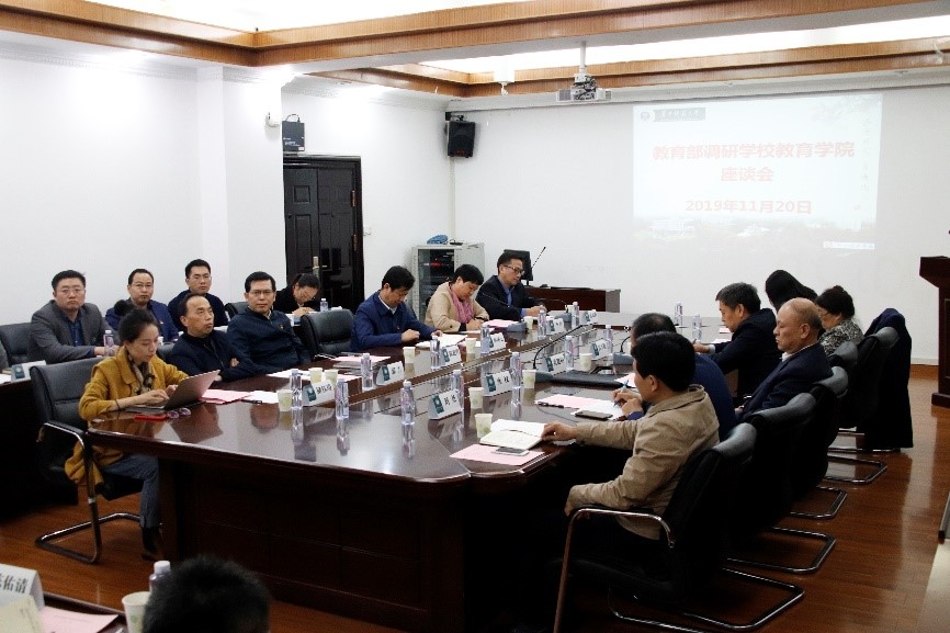 教育学院宣传中心讯(记者 郝文钰 覃娟 张萌 编辑 张莉)11月20日下午,教育部调研学校教育学院座谈会在华中师范大学田家炳教育书院624会议室召开,座谈会以“督导学院‘不忘初心 牢记使命’主题教育开展情况,了解学院学科建设与人才培养,如何发挥学科优势服务和支撑基础教育方面的做法或考虑等情况”为主要调研议题。教育部基础教育司司长吕玉刚及成员、教育部直属高校“不忘初心,牢记使命”主题教育第八巡回指导组组长黄健柏及成员、华中师范大学党委书记赵凌云、学校相关职能部门负责人、教育学院领导班子成员、学科带头人代表、党支部书记代表等参加座谈会。教育学院党委书记李玲主持座谈会。