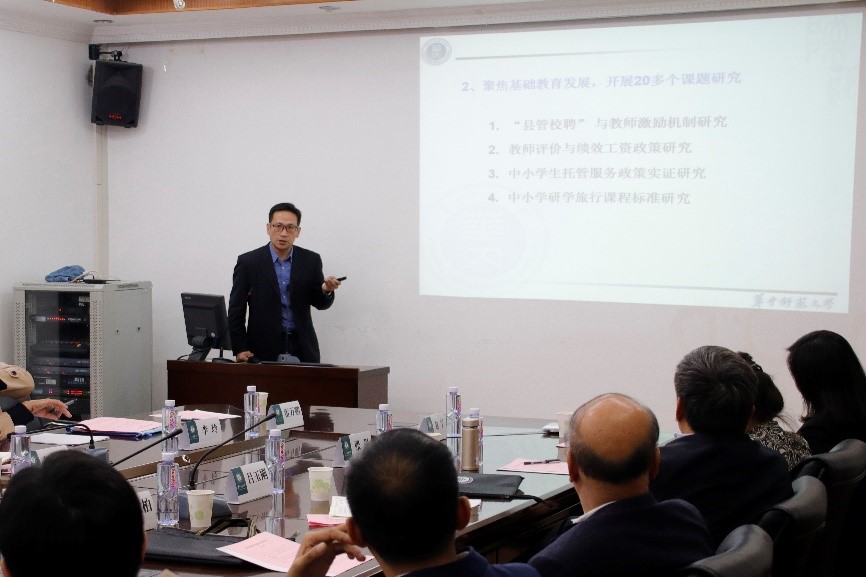雷万鹏代表学院作教育学一流学科建设情况工作汇报。首先,他从学科现有的发展基础出发,介绍了教育学一流学科的整体建设思路。接着,他从学科发展历史、学科发展优势、五大学科建设任务等维度较为深入地介绍了教育学学科建设的基础与优势。最后,雷万鹏从教育学科建设与基础教育发展视角谈了教育学院的四大举措:一是聚焦基础教育发展,大力推动团队建设;二是聚焦基础教育发展,深入开展课题研究;三是建立基础教育发展专题数据库;四是增强校地合作,全力服务基础教育发展。