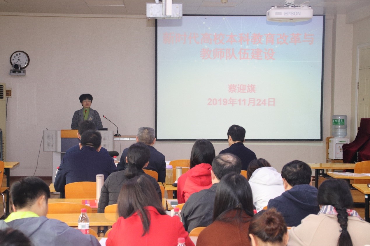 副院长蔡迎旗作《新时代高校本科教育》的主题报告。报告从新时代对高校教师的新要求出发,表示本科教育是高校一切工作的出发点,又是最后的归宿。她强调课程思政、思政课程的重要性,每个老师必须把教书育人结合起来,既教书又育人。最后她结合学院实际,提出本科教育改革的若干设想,希望把重视本科教育落到实处。表示今后将严格执行各项教学管理制度,把学院的本科教学工作推向新的阶段。