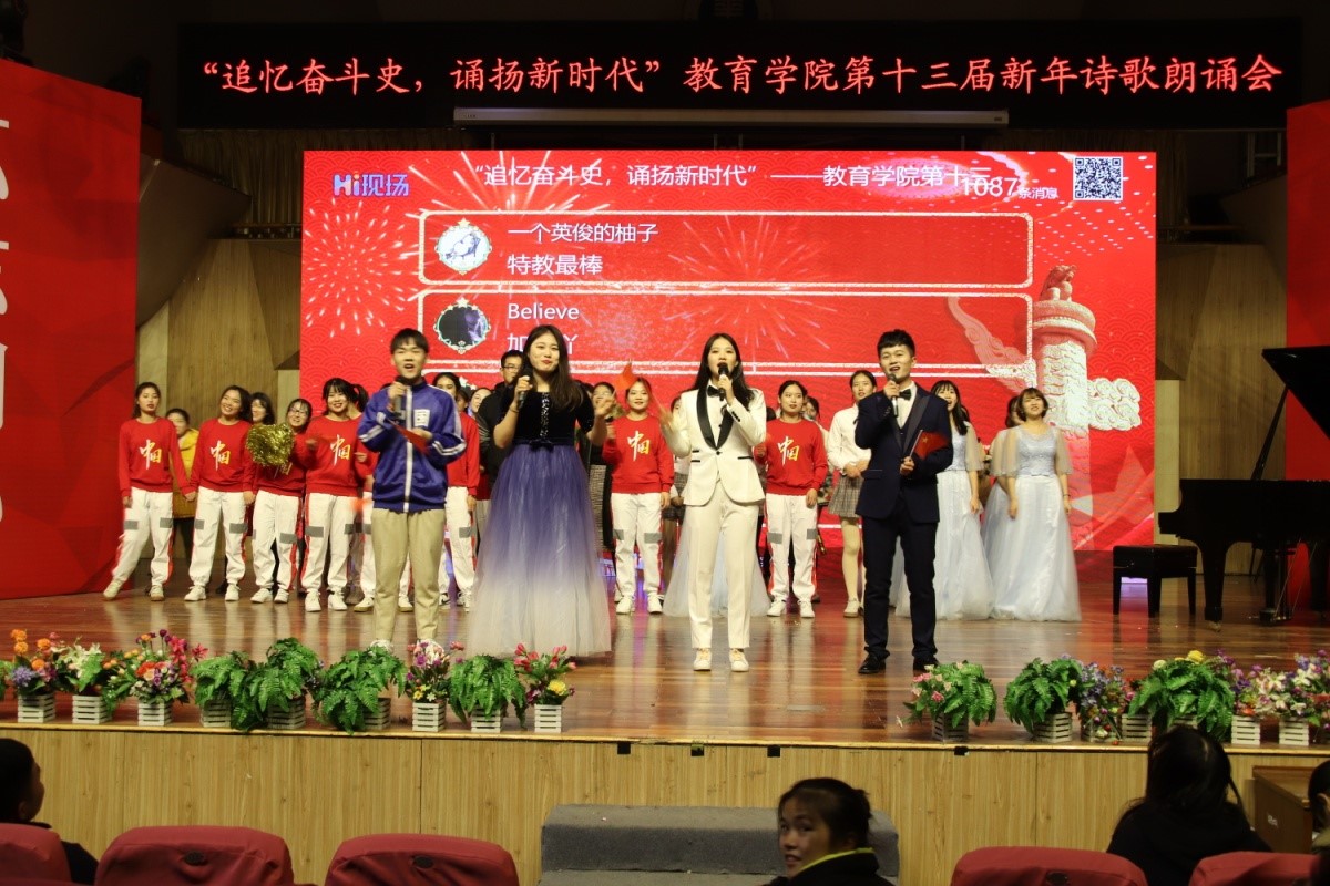 德高望重的资深教授是学院传承红色传统与红色基因的重要力量,主持人刘璇、吴丰瑜带领与会观众欣赏了由我院资深教授董泽芳、郭元祥等原创的诗词,感怀新中国艰辛的发展历程、展望“两个一百年”奋斗目标的光明前景。