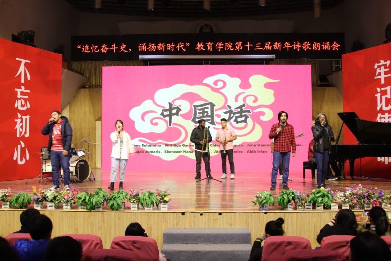 “全世界都在学中国话,孔夫子的话,越来越国际化”,随着中国影响力的不断提升,中国文化、中国智慧也不断影响着世界各国。由教育学院多名外国留学生演绎的歌曲《中国话》唱响了教院人坚定的“一体两翼”发展思路,唱响了教院人面向世界发出中国声音的勇气与魄力,给现场观众以心灵的震撼。