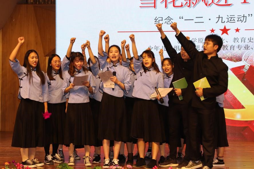 “勤劳勇敢的中国人,意气风发走进新时代”,诗朗诵《走进新时代》以凌云之气魄推开时代浪潮,展现了全体教院人迎接新时代、勇担新使命的昂扬姿态。