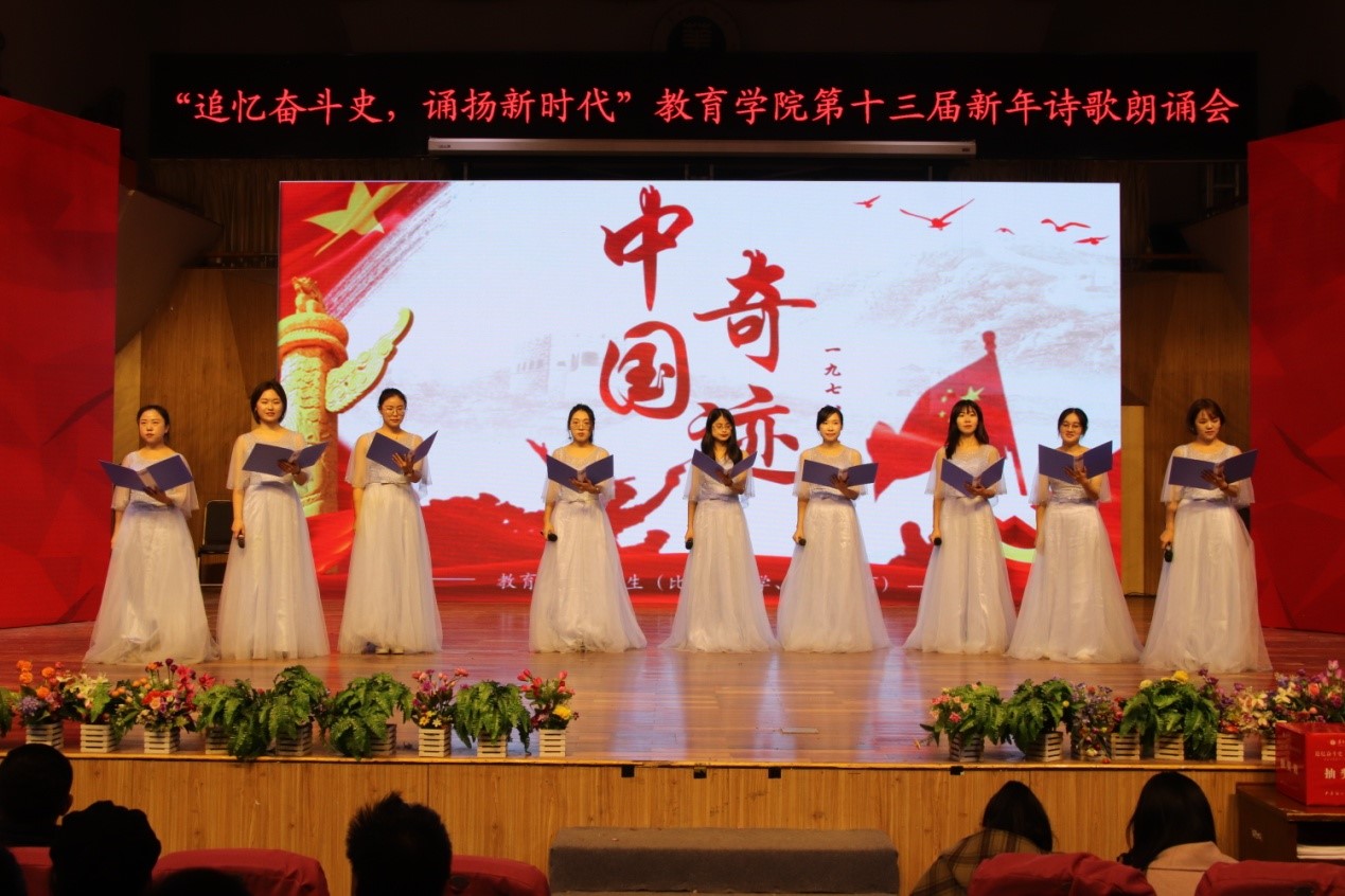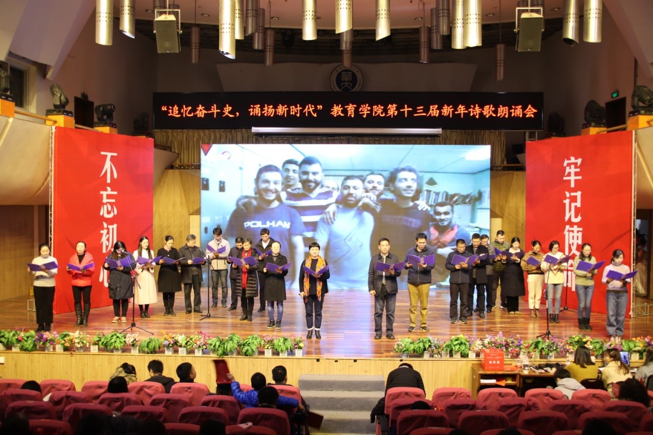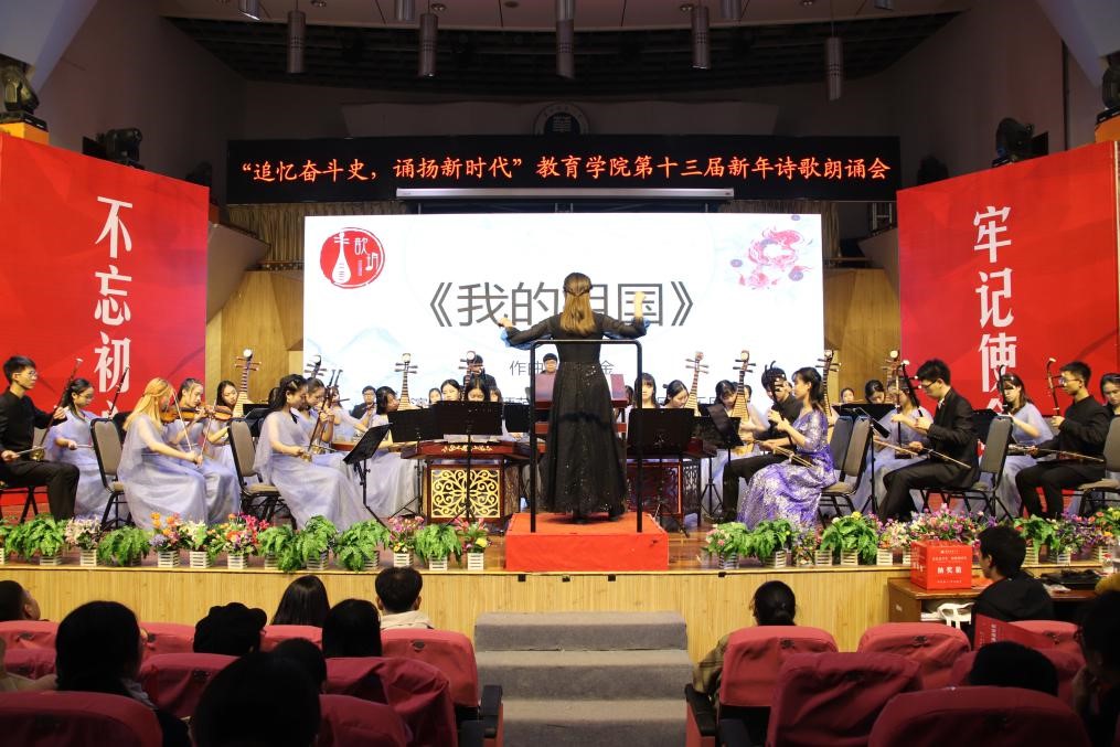 在回顾我院九十五年来不平凡发展历程的视频和华大艺术团民乐团气势磅礴的《我的祖国》演奏声中,本届新年诗歌朗诵会正式拉开帷幕,“一条大河波浪宽,风吹稻花香两岸”, 1956年上映的经典电影《上甘岭》的这首主题曲,真切地反映了有着九十五年历史的华中师范大学教育学院与祖国发展同呼吸、共命运的红色传统,以及一代又一代教院人筚路蓝缕创伟业、敢教日月换新天的红色基因。