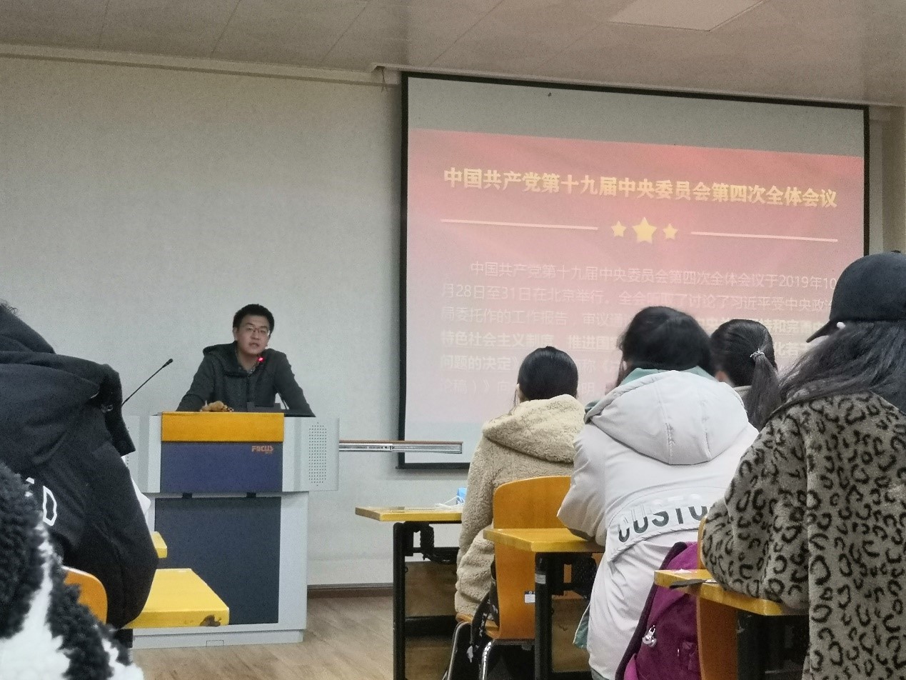 辅导员张萌作了题为“写好教育学院学生思想政治工作奋进之笔——深入学习贯彻党的十九届四中全会精神”专题报告,他以“全会召开的重大意义”、“全会精神的深刻领会”和“学习贯彻全会精神、提升学院学生工作治理能力和治理水平”展开报告。