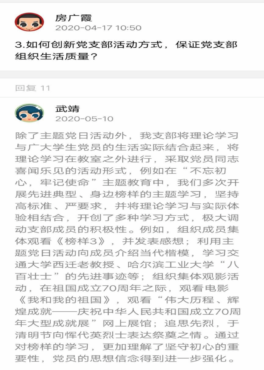 硕研1801党支部范青青同志对支部的线上活动所产生的经验与教训进行了思考,尝试创新疫情期间的支部理论学习模式,采用学生党员喜闻乐见的方式开展活动,密切支部成员的交流,发挥党员的参与感与获得感。支部线上主题党日活动,主要是以党小组为单位,以全体党员为参与者与建设者,通过集体学习、小组研究、个人分享、感想提交的形式密切了支部成员的联系,增强了支部凝聚力;同时强化党员责任义务,激发党员的责任意识,支部及时传达学院关于助学的活动,号召学生党员积极参加,并经常交流经验与心得。