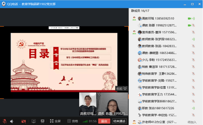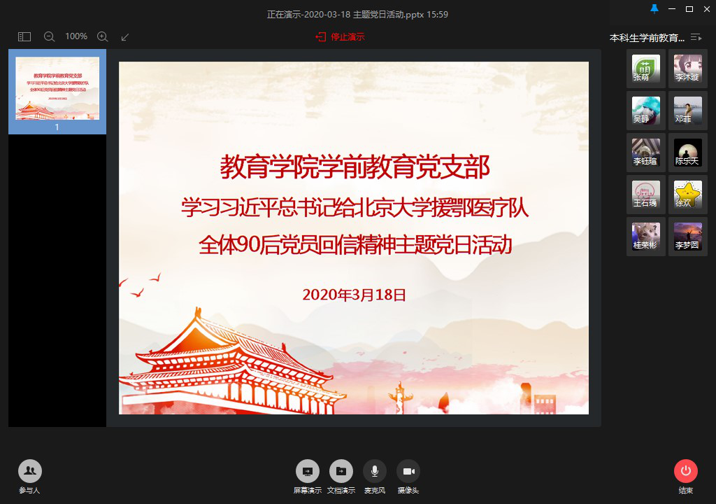教育学院宣传中心讯(记者 华巍等 编辑 张莉)在全国疫情防控战进入稳中向好持续向好的形势下,根据学校组织部的安排,教育学院分党委多形式、创新性地开展了3月份主题党日活动,各支部进行线上会议,在线学习交流与讨论。学习内容主要包括.习近平总书记在湖北省考察新冠肺炎疫情防控工作时的重要讲话精神、习近平总书记给北大援鄂医疗队党员的回信、和《华中师范大学2020年工作要点》。