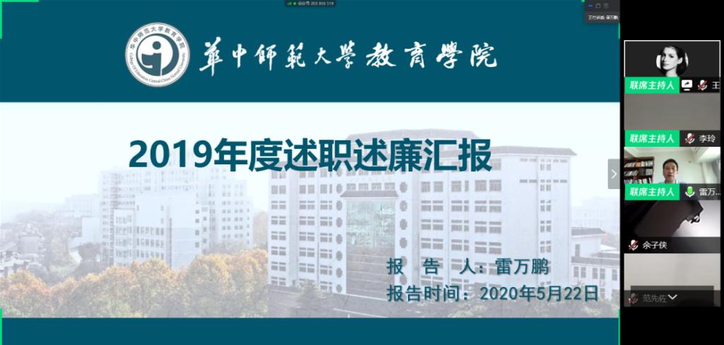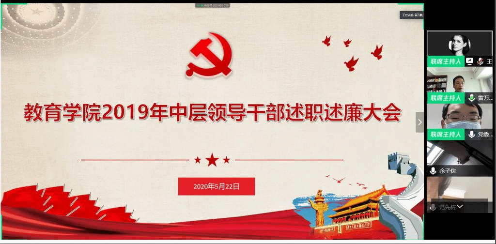教育学院宣传中心讯(通讯员 都杵等 编辑 张莉)5月22日下午,我院利用腾讯会议召开线上2019年度中层干部述职述廉大会。会议由院长雷万鹏主持,校党委宣传部周义出席,我院全体教职工及学生代表参加会议。