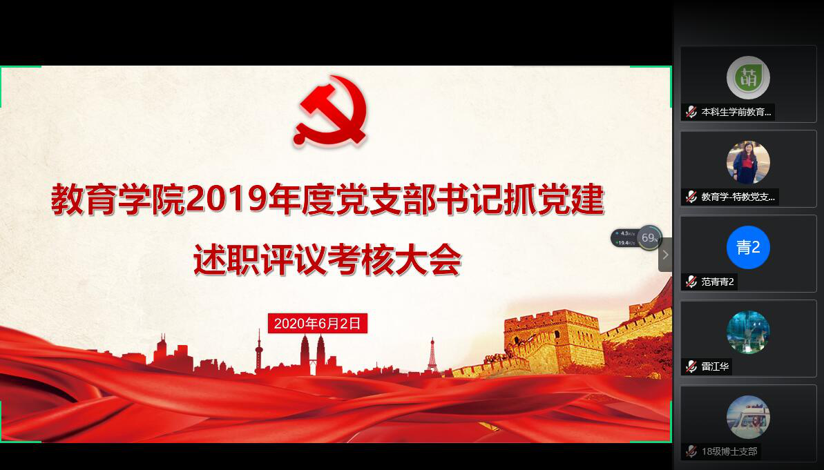 教育学院宣传中心讯(通讯员 华薇等 编辑 张莉)为深入学习贯彻习近平新时代中国特色社会主义思想特别是关于党的基层组织建设重要论述、重要指示批示精神,突出党的全面领导、加强党的政治建设,教育学院于6月2日下午召开了线上2019年度基层党支部书记抓党建述职大会,分党委委员担任评委,18个党支部书记参与评议。