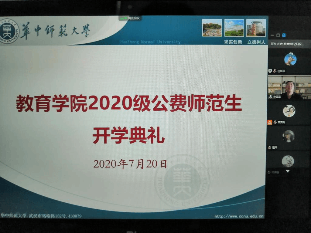 教育学院宣传中心讯(通讯员 杜瑶瑶 编辑 张莉)2020年7月20日上午10点,我院2020级公费师范生在职攻读教育硕士研究生开学典礼在线举行,副院长申国昌、党委副书记张扬、学前教育专业副教授王雯、特殊教育专业副教授朱楠、研究生教学秘书甘安虹以及2020级公费师范生参会,开学典礼由张扬主持。